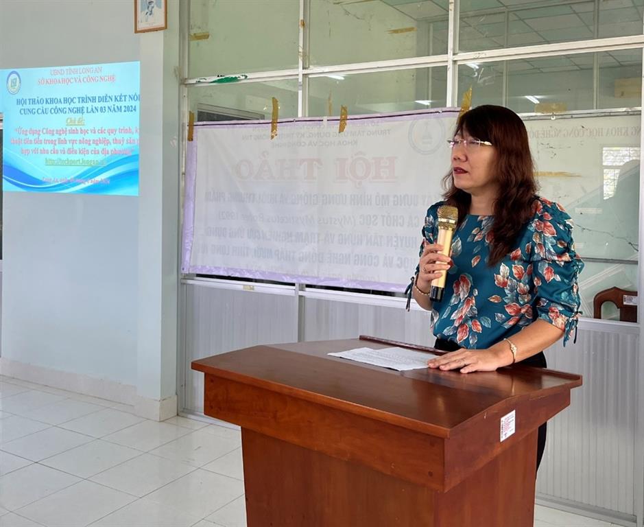 Bên cạnh các hoạt động xúc tiến, kết nối nhu cầu công nghệ với các tổ chức, doanh nghiệp trên địa bàn tỉnh, việc giới thiệu các kỹ thuật, công nghệ cho các HTX nông nghiệp, bà con nông dân vùng Đồng Tháp Mười, tỉnh Long An, cũng được lãnh đạo Sở Khoa học và Công nghệ hết sức quan tâm. Ngày 09/8/2024, Trung tâm Ứng dụng, kỹ thuật, thông tin khoa học và công nghệ - trực thuộc Sở Khoa học và Công nghệ đã tổ chức Hội thảo khoa lần thứ 03 năm 2024 với chủ đề “Ứng dụng Công nghệ sinh học và các quy trình, kỹ thuật tiên tiến trong lĩnh vực nông nghiệp, thuỷ sản phù hợp với nhu cầu và điều kiện của địa phương”. Trung tâm đã phối hợp với Trung tâm Giống Thuỷ Sản An Giang trình bày các trình bày tham luận như “Tiềm năng của nghề sản xuất giống và nuôi thương phẩm cá linh”; “Giới thiệu Công nghệ sản xuất giống nhân tạo và một số hình thức nuôi thương phẩm cá chạch lấu (Mastacembelus favus) hiệu quả tại Đồng bằng sông Cửu Long”; “Tổng quan một số kết quả nghiên cứu về thuỷ sản nước ngọt có thể ứng dụng và nhân rộng tại vùng ĐTM tỉnh Long An” – về các đối tượng cá trê vàng, cá lóc, lươn đồng,… Đại biểu là đại diện các tổ hợp tác, hợp tác xã nuôi thuỷ sản trong vùng, lãnh đạo ngành nông nghiệp địa phương đã rất quan tâm với chủ đề và các nội dung tham luận đã trình bày; mong muốn sau cuộc Hội thảo sẽ có nhiều mô hình được triển khai ứng dụng và nhân rộng đến với địa phương trong vùng theo chủ trương của Quyết định số 21/2021/QĐ-UBND ngày 18/6/2021 của UBND tỉnh Long An Về việc triển khai thực hiện Nghị quyết số 03/2021/NQ-HĐND ngày 30/3/2021 của Hội đồng nhân dân tỉnh về chính sách hỗ trợ nhân rộng kết quả nghiên cứu khoa học và ứng dụng tiến bộ công nghệ, đổi mới sáng tạo trên địa bàn tỉnh Long An giai đoạn 2021 – 2025.