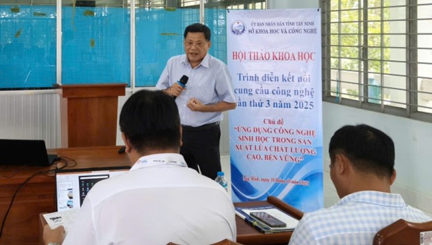 Hội thảo được tổ chức với chủ đề “Ứng dụng công nghệ sinh học trong sản xuất lúa chất lượng cao, bền vững” đã thu hút hơn 50 đại biểu đến từ phòng Văn hoá Xã hội và Hội Nông dân các xã, phường trên địa bàn tỉnh; đại diện các hợp tác xã, tổ hợp tác canh tác lúa và người dân quan tâm đến chủ đề của hội thảo. Phát biểu khai mạc hội thảo, Ths. Nguyễn Minh Hải – Phó Giám đốc Sở Khoa học và Công nghệ cho biết mục đích cốt lõi của hội thảo là tạo một diễn đàn kết nối trực tiếp và hiệu quả giữa bên cung cấp công nghệ - Viện Nghiên cứu Nông nghiệp Thành Thành Công, với bên có nhu cầu ứng dụng là các hợp tác xã, tổ hợp tác và bà con nông dân, nhằm giới thiệu những công nghệ tiên tiến, những kết quả nghiên cứu có tính ứng dụng cao, góp phần giải quyết các bài toán thực tiễn trong canh tác lúa; qua đó hiện thực hóa chủ trương của Nghị quyết 57 ngay tại địa phương, góp phần khẳng định vai trò đột phá chiến lược của khoa học, công nghệ, đổi mới sáng tạo và chuyển đổi số trong công cuộc tái cơ cấu ngành nông nghiệp theo hướng nâng cao giá trị gia tăng, phát triển xanh và bền vững.